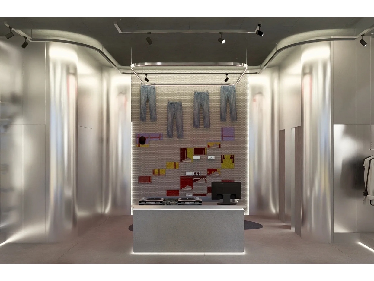 Para equilibrar a frieza industrial, foram aplicados toques de verde ácido, uma cor que comunica juventude, frescor e vitalidade, marcando a transição da marca para essa nova fase de inovação. Os materiais — metal polido, acrílico translúcido, iluminação em LED linear e mobiliários modulares — criam uma atmosfera high-tech e experimental, em sintonia com a ideia de que a loja não é apenas um ponto de venda, mas um palco de experiências.
