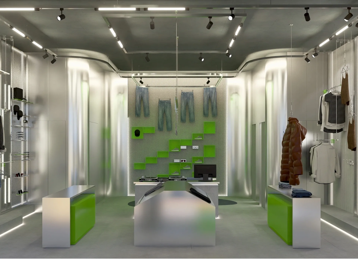 Para equilibrar a frieza industrial, foram aplicados toques de verde ácido, uma cor que comunica juventude, frescor e vitalidade, marcando a transição da marca para essa nova fase de inovação. Os materiais — metal polido, acrílico translúcido, iluminação em LED linear e mobiliários modulares — criam uma atmosfera high-tech e experimental, em sintonia com a ideia de que a loja não é apenas um ponto de venda, mas um palco de experiências.