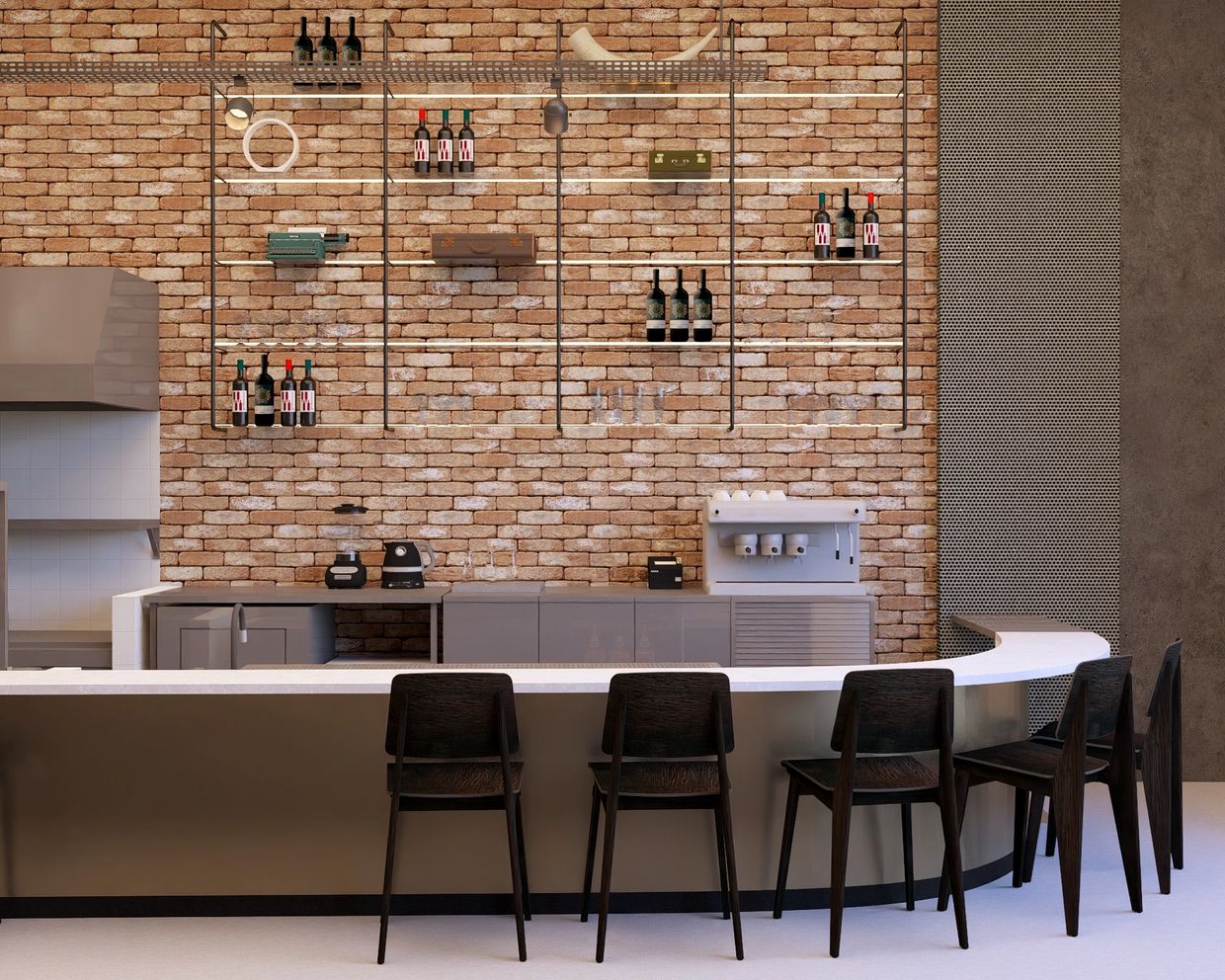 O contraste entre o espaço cru e o acabamento refinado do balcão em mármore ou superfícies claras reforça a higiene e o cuidado, essenciais em uma operação de fine dining.